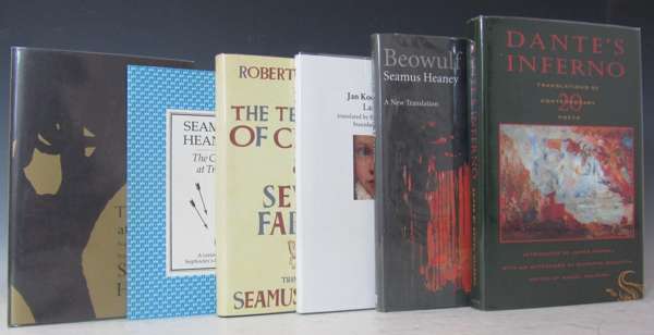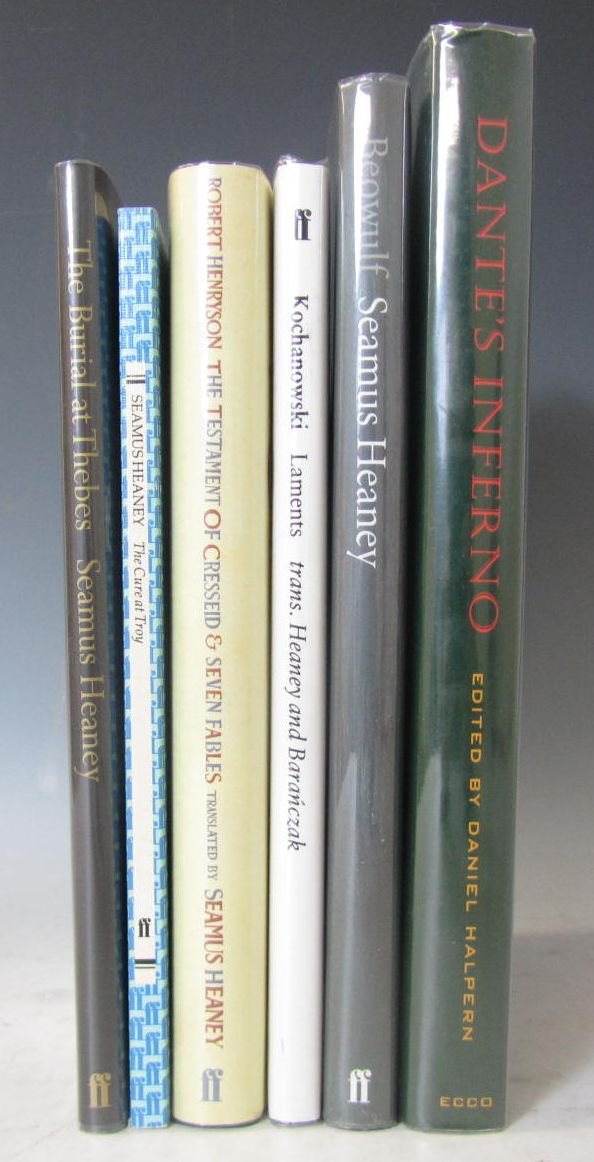The burial at Thebes: Sophocles' Antigone translated by Seamus Heaney. London: Faber and Faber, 2004. First edition, publisher's cloth, dustwrappers, signed by Heaney on the titlepage; Henryson, Robert. The testament of Cresseid & seven fables, translated by Seamus Heaney. London: Faber and Faber, 2009. First edition, 8vo., publisher's cloth, dustwrappers, signed by Heaney on the titlepage; Kochanowski, Ian. Laments, translated by Seamus Heaney and Stanislaw Baranczak. London: Faber and Faber, 1995. First edition, 8vo., publisher's cloth, dustwrappers, signed by Heaney on the front free endpaper (Brandes & Durkan A63a); Beowulf translated by Seamus Heaney. London: Faber and Faber, 1999. First edition, 8vo., publisher's paper boards, dustwrappers, signed by Heaney on the titlepage (Brandes & Durkan A72a); The Cure at Troy a version of Sophocles' Philoctetes. London: Faber and Faber in association with Field Day, 1990. First English edition, small 8vo., publisher's paper covers. (Brandes & Durkan A 49 b); Dante Alighieri. Dante's Inferno; translations by twenty contemporary poets. Hopewell (N.J.): The Ecco Press, 1993. First edition, 8vo., publisher's quarter cloth, paper covered boards, dustwrappers. (Brandes & Durkan B133) (6)