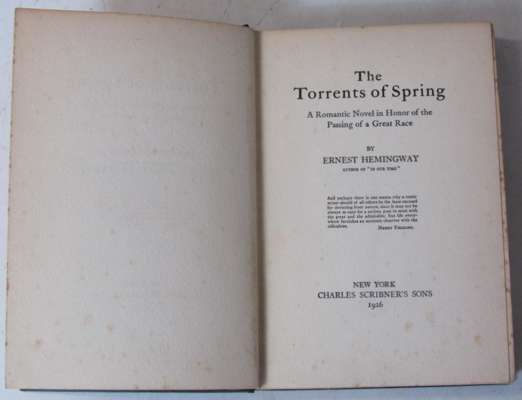 The torrents of spring. New York: Charles Scribner's Sons, 1926. First edition, 8vo, original dark green cloth, some slight internal foxing spine a little faded and very slightly frayed at ends