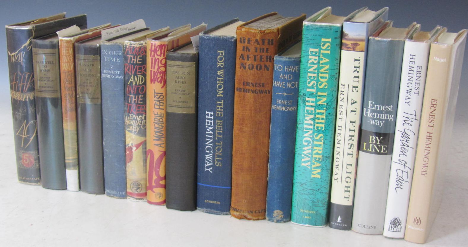 The fifth column and the 40 first short stories. London: Jonathan Cape, 1939. First British edition, green cloth, dustwrapper, cloth slightly faded and soiled, dustwrapper price-clipped with some rubbing and loss to spine; [Idem] A farewell to arms. New York: Charles Scribner's Sons, 1929. First edition, black cloth with bronze-coloured labels to upper cover and spine, without dustwrapper; [Idem] The old man and the sea. London: Jonathan Cape, 1952. First British edition, 8vo, blue printed cloth, dustwrapper, previous owner's signature to front free-endpaper, some fading to spine and covers, dustwrapper not price-clipped but a little faded and chipped with partial loss to spine; [Idem] Winner take nothing. New York: Charles Scribner's Sons, 1933. First edition, 8vo, black cloth with bronze-coloured label to upper cover and spine, some internal spotting, bookseller's stamp to final paste-down endpaper, spine a little faded and frayed, label to spine chipped, without dustwrapper; [Idem] In our time. London: Jonathan Cape, 1926. First British edition, 8vo, blue cloth, a little spotting to initial and final few pages, some rubbing and fading to covers, without dustwrapper; [Idem] Across the river and into the trees. London: Jonathan Cape, 1950. First British edition, 8vo, green cloth, dustwrapper, previous owner's signature to front free-endpaper, spine a little faded, dustwrapper not price-clipped but a little creased, chipped and rubbed; [Idem] A moveable feast. London: Jonathan Cape, 1964. First British edition, 8vo, red cloth, dustwrapper price-clipped and a little faded and soiled; [Idem] The sun also rises. New York: Charles Scribner's Sons, 1926[?] First edition? but later imprint with no date on titlepage, 8vo, black cloth with bronze-coloured labels to upper cover and spine, some slight internal spotting, a couple of gift inscriptions to front free-endpaper, covers and labels slightly rubbed and faded; and 8 others (16)