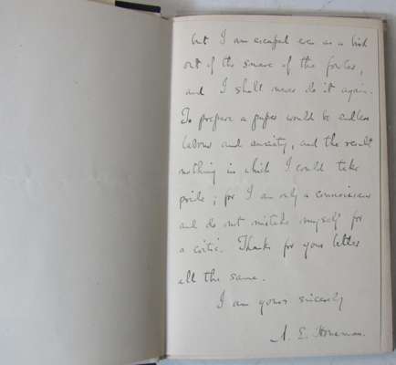 Note: Carter & Sparrow 5. First impression without the punctuation at line 2 on p. 52. Tipped in at the front is a two page A.L.S., dated 28 Oct. 1922, from the Housman to E.V. Lucas explaining at some length his reasons for refusing to do a reading or give a paper to the English Association. "To prepare a paper would be endless labour and anxiety, and the result nothing in which I could take a pride, for I am only a connoisseur and do not mistake myself for a critic." Accompanied by two letters, dated 2002, to Bruce Ritchie from Archie Burnett, Professor of English at Boston University about the inclusion of the letter in the Oxford edition of Housman's correspondence which Burnett was then editing.