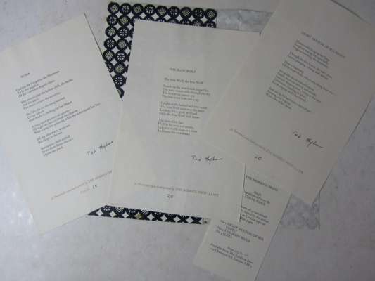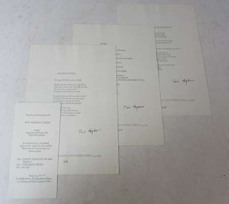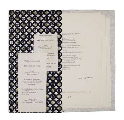 Single unpublished poems by Ted Hughes: Night arrival of sea trout, The iron wolf, Puma. Folio, [Devon], Morrigu Press, 1979, together 3 broadsides, each number 20 of 30 copies, signed by the poet, loose as issued with prospectus in folder of decorative Japanese paper with white printed label, broadsides 298 x 200mm., presentation copy inscribed on folder "[?] Martin Booth, May 29, 79, a gift from Olwyn [Hughes]"