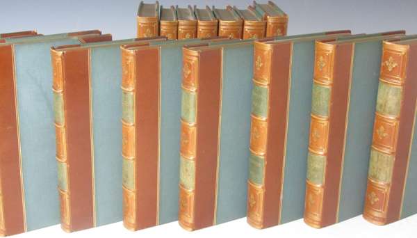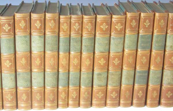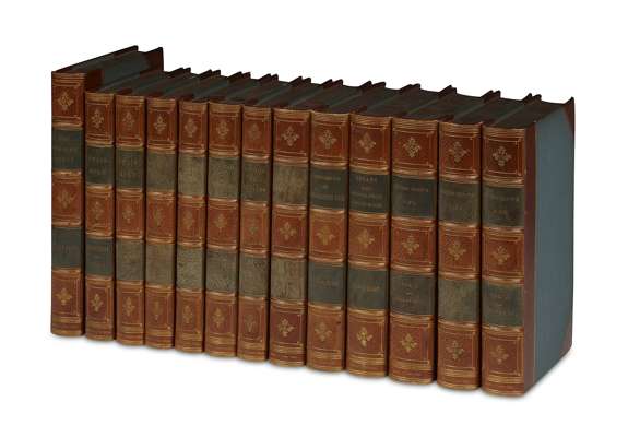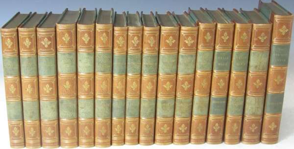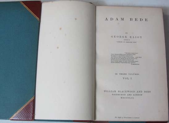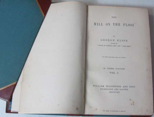 Scenes of clerical life. Edinburgh: W. Blackwood, 1858. Half-titles; Adam Bede. Edinburgh: W. Blackwood, 1859. 3 volumes; [Idem] The mill on the Floss. Edinburgh: W. Blackwood, 1860. 3 volumes, half-titles; [Idem] Silas Marner. Edinburgh: W. Blackwood, 1861; [Idem] Romola. London: Smith, Elder & Co., 1863. 3 volumes, neat repair to lower margin of volume 1; Felix Holt. Edinburgh: W. Blackwood, 1866. 3 volumes, half-titles; [Idem] The Spanish gypsy. Edinburgh: W. Blackwood, 1868; [Idem] Middlemarch. Edinburgh: W. Blackwood, 1871-72; [Idem] The legend of Jubal. Edinburgh: W. Blackwood, 1874; [Idem] Daniel Deronda. Edinburgh: W. Blackwood, 1876; [Idem] Impressions of Theophrastus Such. Edinburgh: W. Blackwood, 1879; [Idem] Essays and leaves from a note-book. Edinburgh: W. Blackwood, 1884; Cross, J.W. George Eliot's life. Edinburgh: W. Blackwood, 1885. 3 volumes, 8vo; all first editions, uniform late nineteenth century brown half morocco by Birdsall, t.e.g., green morocco lettering pieces, occasional light spotting, a fine set (29)