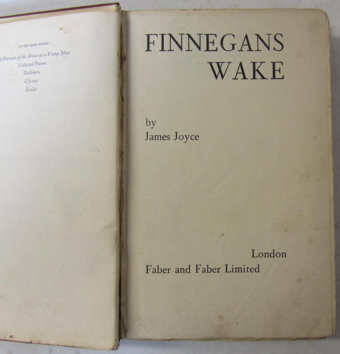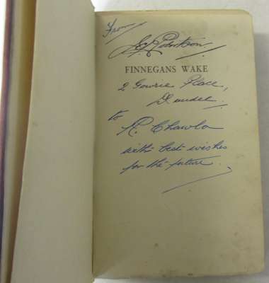 Finnegans wake. London: Faber and Faber Limited, 1939. First edition, 8vo., publisher's red cloth, t.e. stained yellow, others uncut, inscription on the half title, endpapers and last leaf a little discoloured, inner joints weak, titlepage with a few spots