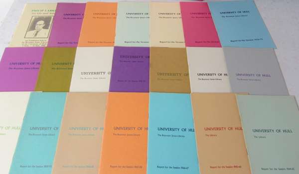 The Brymore Jones annual library reports. [1954-55, - 1983-84], 21 issues (lacking report for 1955-56, 1956-57 & 1961-62), with a typed letter signed from Larkin to the Head of the School of Librarianship, Loughborough College of F.E., regarding a visit to the University of Hull library, 2 April 1962; Larkin, Philip Aubade. Salem: Charles Seluzicki, 1980. 8vo, one of 250 copies initialled by the author, original grey wrappers & envelope; with 5 other items, red cloth box lettered "Philip Larkin Ephemera"