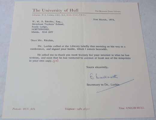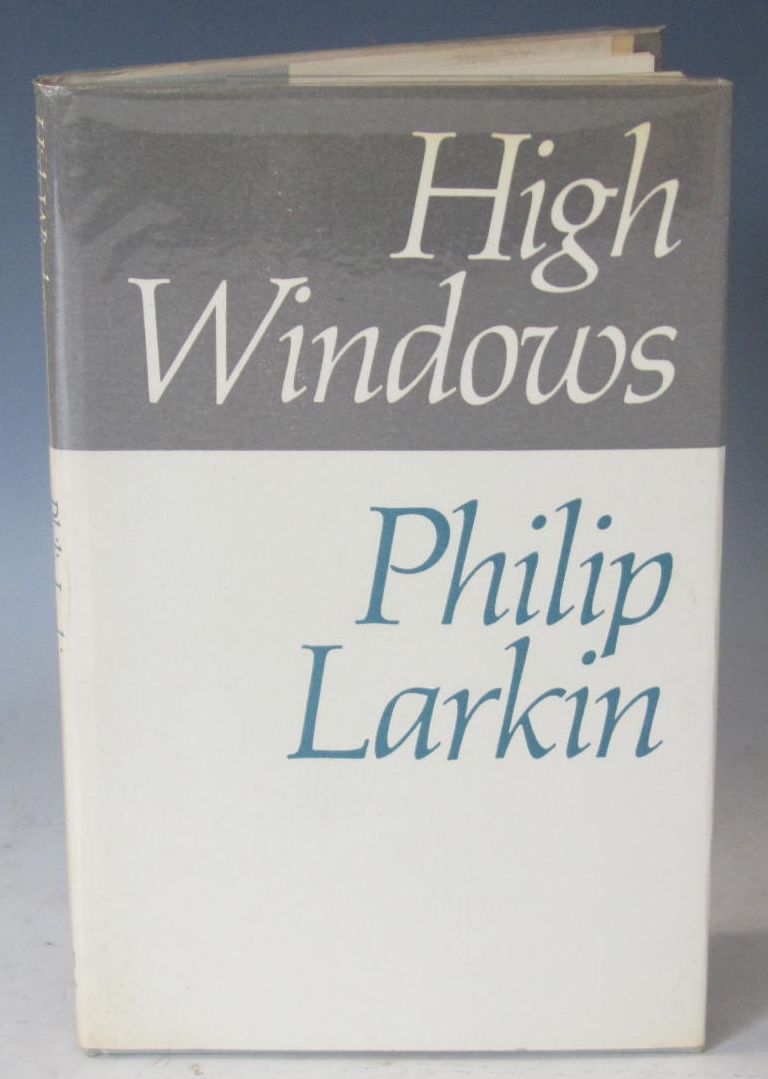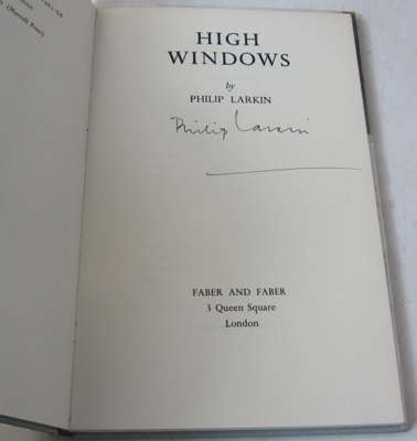 High windows. London: Faber & Faber, 1974. First edition, signed by the author on title, original cloth, dustwrapper, [Bloomfield A10a], with a typed letter signed to Bruce Ritchie from Dr Larkin's Secretary, saying that Dr Larkin has signed his books, thanks him for his interest in what he has written, and reports that Larkin has corrected at least one of the misprints in Ritchie's copy, University of Hull, Brynmor Jones Library, headed paper, 31 March 1978