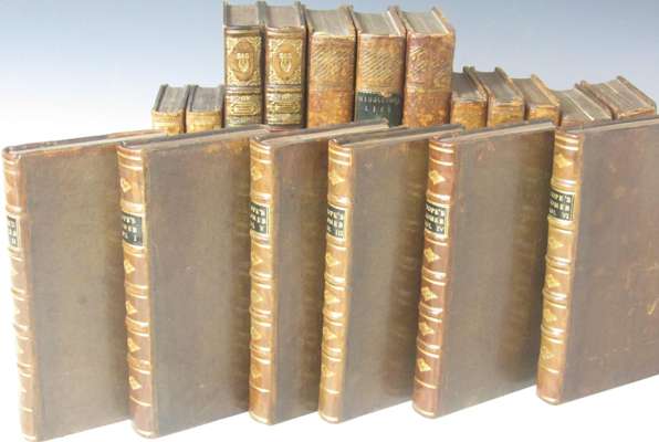 The Iliad. Translated by Alexander Pope. London: H. Lintot, 1743. 6 volumes, 12mo, engraved plates, license leaf in all volumes except vol.2, contemporary calf, neatly rebacked, spines gilt; Pope, Alexander The poetical works. London, 1821. 2 volumes, 8vo, contemporary calf, gilt; Horace. Opera. London: G. Sandby, 1749. 2 volumes, 12mo, engraved title vignettes, engraved plates, contemporary calf, neatly rebacked; Middleton, C. The life of Marcus Tullius Cicero. London, 1801. 3 volumes, 8vo, contemporary calf, rubbed, joints split; Ovid. Metamorphoses. 1773. 2 volumes, 12mo, engraved plates, calf, rubbed, a cover detached; Livius, Titus. Historiarum ab urbe condita. Oxford: Theatro Heldoniano, 1708. 6 volumes, 8vo, contemporary calf, worn, one cover detached; and 3 others (24)