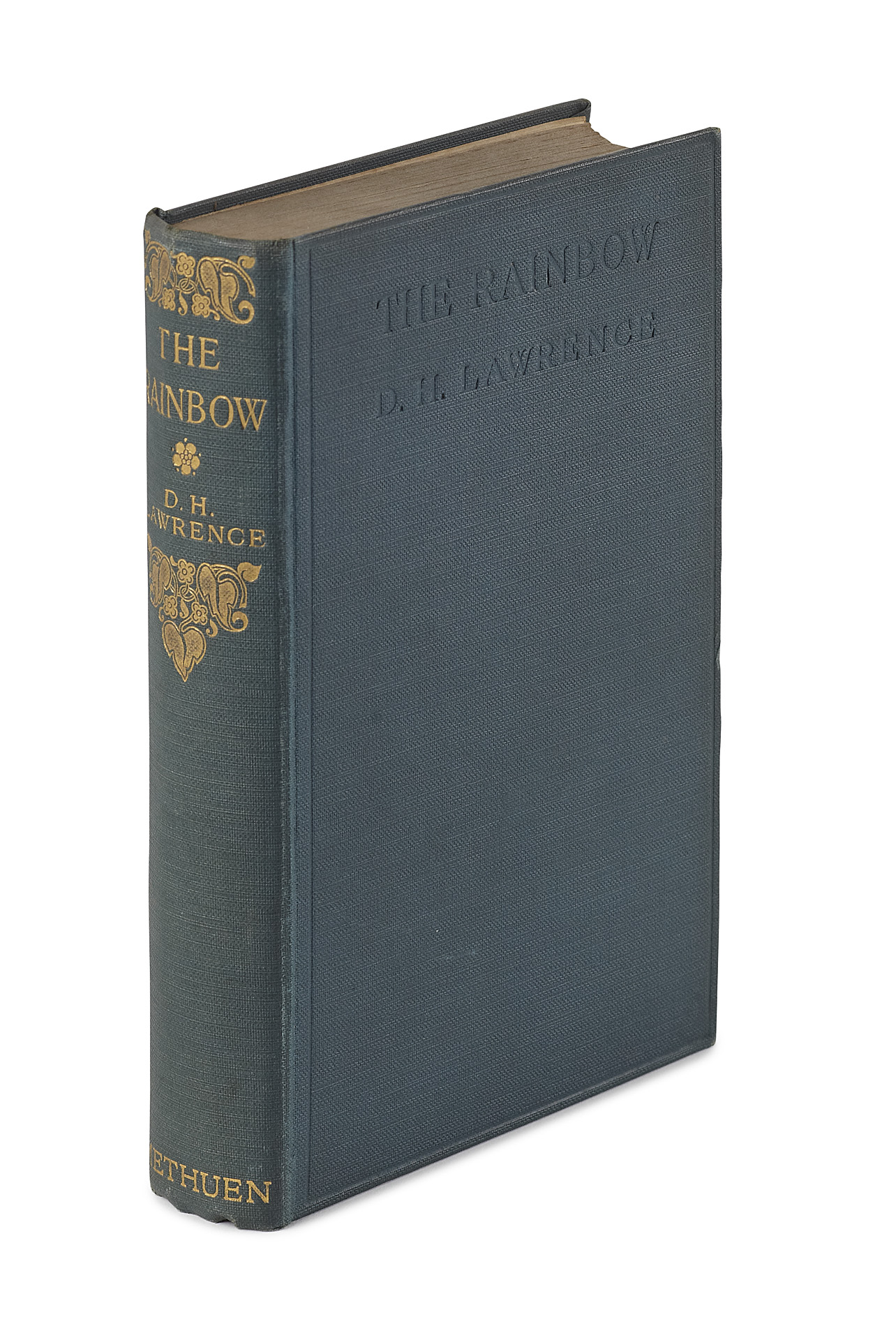 The rainbow. London: Methuen & Co. Ltd., 1915. First edition, 8vo., with 4pp. of adverts, publisher's blue-green cloth, bottom edge untrimmed, very slight war at head, tail and corners, pencilled signature on front pastedown, tipped in contemporary newspaper account of the prosecution of Messrs Methuen for publication and the order for the destruction of copies, slight foxing of fore-edges