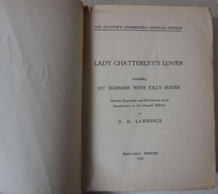Lady Chatterley's lover: including My skirmish with Jolly Roger; written especially and exclusively as an introduction to this popular edition. [Paris]; Privately printed, 1930. The author's unabridged popular edition, 8vo., publisher's brown paper wrappers with phoenix emblem printed in black on upper wrappers, with price 60 Frs, edges uncut, loss to head and tail of spine with some wear to other extremities