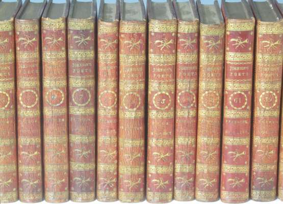 The works of the English poets. London: for C. Bathurst, [&c.], 1779-81. 68 volumes, 12mo, 28 engraved frontispiece portraits, contemporary red morocco gilt, g.e., some offsetting from frontispieces to title-pages, volume 1 of the Prefaces without the Directions to the Binder and Errata leaves, volume 5 of the Prefaces without the portrait of Samuel Johnson, no half-titles bound in, volume 56 lacking title page, spines slightly faded, a few volumes slightly rubbed at head