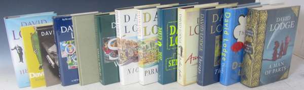 Small world. London: Secker & Warburgh, 1984;[Idem] Nice work. London: Secker & Warburg, 1988; [Idem] Paradise news. London: Secker & Warburg, 1991; [Idem] Thinks. London: Secker & Warburg, 2001;[Idem] Out of the shelter. London: Secker & Warburg, 1984. Second edition; [Idem] Therapy. London: Secker & Warburg, 1995; [Idem] The man who wouldn't get up and other stories. Bridgewater Press, 1998. Limited to 138 copies, one of 100 copes signed by the author and bound in cloth; [Idem] Author, author. London: Secker & Warburg, 2004; [Idem] The year of Henry James. London: Harvill Secker, 2006; [Idem] Deaf sentence. London: Harvill Secker, 2008; [Idem] A man of parts. London: Harvill Secker, 2011; all original cloth, dustwrappers, all First editions, all signed by the author on the titlepage; [Idem] Home truths. London: Secker & Warburg, 1999, signed by the author on title, paperback; and an unsigned paperback, and a T.L.S. from David Lodge to Bruce Ritchie, thanking him for his compliments on Deaf Sentence, and including a British Council concertina biography of Lodge dated 1994 (13 volumes, and a letter)