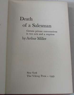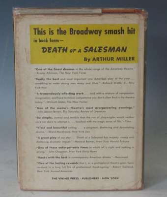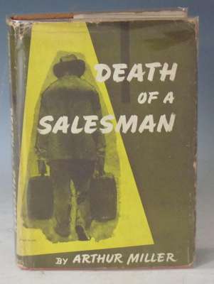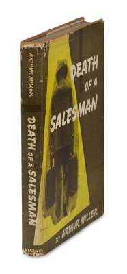 Death of a salesman. New York: Viking, (March [May]), 1949. First edition, 8vo, with loose slip of paper signed by Arthur Miller, original orange cloth printed in black with house motif, dustwrapper, some very occasional light internal spotting, fading and spotting to spine and boards, dustwrapper a little soiled, creased and chipped