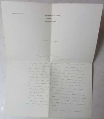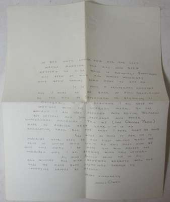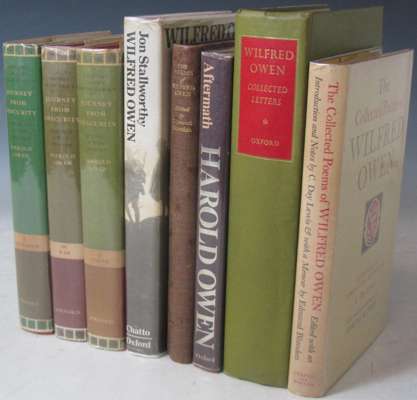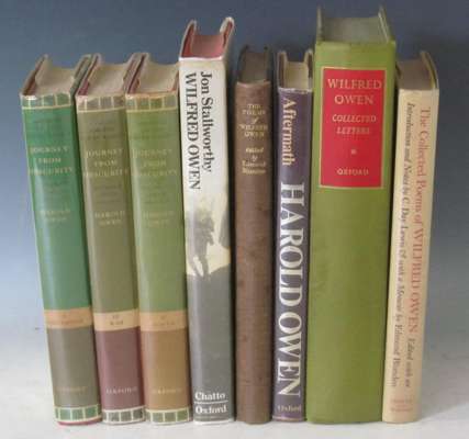 Memoirs of the Owen family by Harold Owen. London: Oxford University Press, 1963-1965. First editions, 8vo, 3 volumes, all signed by the author and dedicated to Lady Onslow, with a signed letter from Harold Owen to Lady Onslow dated July 25th 1994, apologising for not having been able to meet with her on a couple of occasions due to ill health, writing about some of his literary endeavours and offering an inscribed copy of what can be assumed to be the second volume of the Memoirs, original orange cloth, dustwrappers slightly browned along spines and a little chipped in places, price-clipped; Owen, Wilfred - Blunden, Edmund The poems of Wilfred Owen. London: Chatto & Windus, 1931. 8vo, number 35 of 160 copies, signed by Blunden on page 41, portrait frontispiece, original brown cloth, slight spotting to initial pages, edges and covers; Stallworthy, Jon Wilfred Owen, a biography. London: Oxford University Press, 1974. 8vo, original orange cloth, dustwrapper slightly faded and a little rubbed and bumped in places; and 3 others relating to Wilfred and Harold Owen (8)