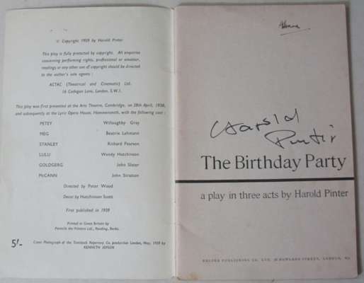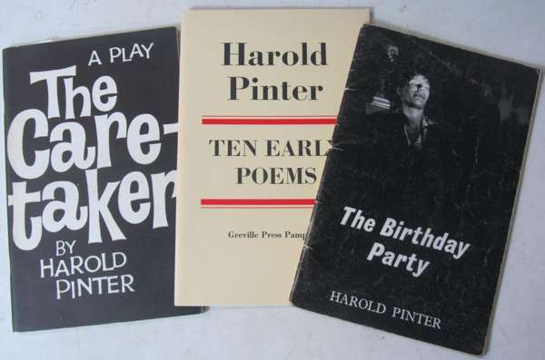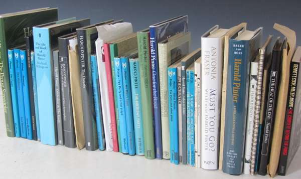 The birthday party. London: Encore, 1959. First edition, 8vo, signed by Pinter on titlepage, photographic cover, a little rubbed; [Idem] Ten early poems. Greville Press, 1992. First edition, 8vo, cream printed wrappers; [Idem] The caretaker. London: Encore, [1960]. First edition, 8vo, signed by Pinter on titlepage; [Idem] I know the place. Warwick: Greville Press, [1979?] 8vo, number 344 of 500 copies signed by Pinter, 4 plates, black cloth; [Idem] Landscape and silence. London: Methuen, 1969. First edition, 8vo, signed, 'To Bruce Ritche/ Best Wishes/ Harild Pinter', dustwrapper; [Idem] The hothouse. London: Eyre Methuen, 1980. 8vo, signed by Pinter on titlepage, dustwrapper; [Idem] Betrayal. London: Eyre Methuen, 1978. First edition, dedicated from Pinter to Bruce Ritchie on titlepage, dustwrapper; [Idem] The Proust screenplay. London: Eyre Methuen, 1978. First edition, 4to, front free-endpaper signed by Pinter, dustwrapper; [Idem] Old times. London: Methuen & Co, 1971. First edition, 8vo, dedicated on titlepage from Pinter to Bruce Ritchie, dustwrapper; a signed black and white photograph of Harold Pinter, 165x111mm; and 35 others (44)