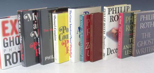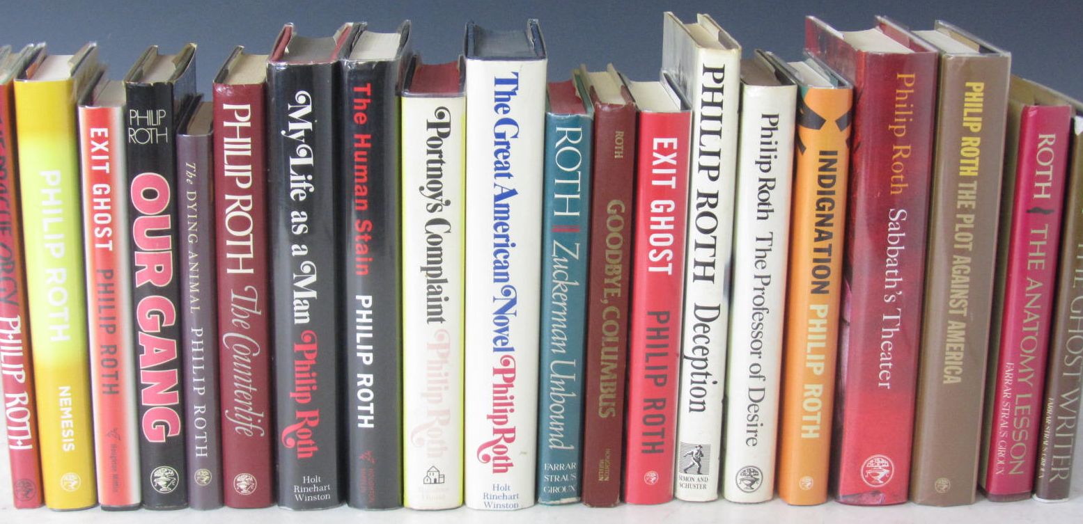Goodbye, Columbus. Boston: Houghton Mifflin, 1959. First edition, original two-tone boards, lacks dustwrapper; [Idem] Portnoy's complaint. New York: Random House, [1969]. First edition, dustwrapper price clipped and spine faded; [Idem] The great American novel. New York: Holt, Rinehart &c., 1973. First edition; [Idem] My life as a man. New York: Holt, Rinehart &c., 1974. First edition, dustwrapper price clipped; Idem Zuckerman unbound. New York: Farrar, Strauss, Giroux, 1981. First edition; [Idem] Deception. New York: Simon & Schuster, 1990. First edition, dustwrapper slightly soiled; Idem The human stain. Boston: Houghton Mifflin, 2000. First edition; [Idem] Exit ghost. Boston: Houghton Mifflin, 2007. First edition; [Idem] The professor of desire. London: J. Cape, 1978. First U.K. edition, signed by the author and also by the book's dedicatee, Claire Bloom; all but the first with dustwrappers; and 11 others, including 9 first U.K. Jonathan Cape editions (20)