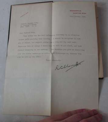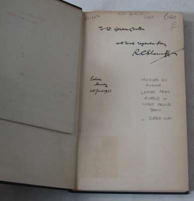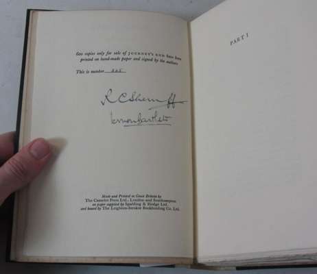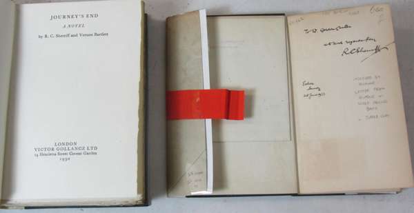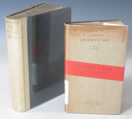 Journey's end. A play in three acts. London: V. Gollancz, 1929. First edition, inscribed "To W. Gordon Carter, with kind regards from R.C. Sherriff, Esher, Surrey, 26 June 1933", 8vo, original black cloth, dustwrapper, and with orange wrap-around band "Journey's End. Now being performed at the Savoy Theatre", Typed Letter Signed discussing similar habits to Capt. Coke tipped in; Sherriff, R.C. & V. Bartlett Journey's end, a novel. London: V. Gollancz, 1930. First edition, 8vo, number 245 of 600 copies signed by the authors, original vellum-backed cloth, uncut, spine gilt (2)