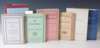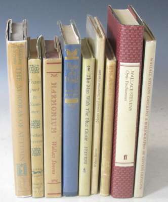 Harmonium. New York: A.A. Knopf, 1931. Second edition, fourth binding of tan cloth, [Edelstein A1.b], original gray dustwrapper splitting along upper spine fold and spine slightly discoloured; [Idem] Ideas of order. New York: A.A. Knopf, 1936. Second edition, first binding of vertically striped pink, white, yellow and gray cloth, dustwrapper rubbed at head and base, with 2cm tear to upper wrapper and somewhat dust-soiled, [Edelstein A2.b]; [Idem] Notes toward a supreme fiction. Cummington: Cummington Press, 1942. First edition, number 14 of 190 copies on Dutch Charcoal of a total edition of 273 copies, original white cloth, uncut, [Edelstein A6.a], occasional light spotting, binding lightly soiled, without the glassine dustwrapper; [Idem] The man with the blue guitar. New York: A.Al. Knopf, 1937. First edition, [EdelsteinA4.a], original yellow cloth, without dustwrapper, spine slightly faded, binding lightly marked; [Idem] Parts of a world. New York: A.A. Knopf, 1942. First edition, original blue cloth, [Edelstein A5.a.1], without dustwrapper, a trifle soiled; [Idem] Transport to Summer. New York: A.A. Knopf, 1947. First edition, publisher's Review Slip loosely inserted, original black cloth-backed green boards, uncut, dustwrapper discoloured and slightly marked; [Idem] The auroras of Autumn. New York: A.A. Knopf, 1950. First edition, original cloth, pink dustwrapper spine slightly rubbed at head and tail and slightly discoloured, two short tears, [Edelstein A14.a.1]; [Idem] A primitive like an orb. Gotham Book Mart: Banyan Press, March 1948. 8vo, limited to 500 copies, 2 illustrations by Kurt Seligman, original green wrappers a little faded; and 2 others (10)
