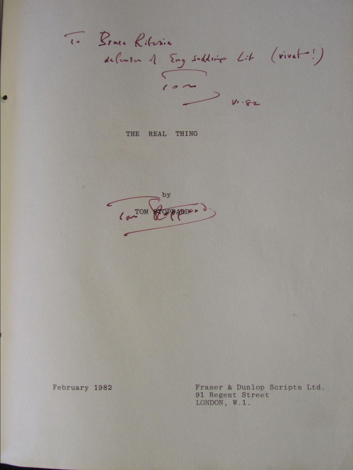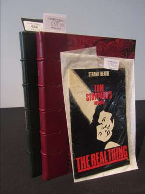 Note: "Staged in the West End and then on Broadway, The Real thing became one of Stoppard's most popular and longest-running plays, opening on 16 Novemebr 1982 at the Strand with Felicity Kendal ... and Roger Rees ... in the lead roles.... The Real thing is by Stoppard's own admission a self-referencing work, a term Stoppard used to draw on his own experience in the theatre and, presumably, in love. The play also takes on a strange prescient quality, given his later relationship with Kendal. He completed the work in march 1982, changing the original protagonist from a novelist to a playwright ..." (Ira Nadel Double act: a life of Tom Stoppard, London, 2002, pp. 321 and 323). The typescript is accompanied by a programme for the Strand Theatre 1983 production signed by Felicity Kendall, Roger Rees, and other members of the cast. Also included is a bound photocopy of the original MS of Stoppard's libreto for Prokofiev's The Love for three oranges now at the Bancroft Library, University of California and of the typescript of The Frog prince. This has been bound in quarter red morocco by Allison & Downie to match the typescript of The Real thing. Bound in at the front is the broadside containing an extract from the first British edition of The Real thing, the speech by Henry, holding his cricket bat, signed in red ink by Stoppard. 500 copies of the broadsheet were produced of which this is no 372 (Baker & Wachs A18a note five.)