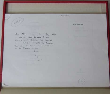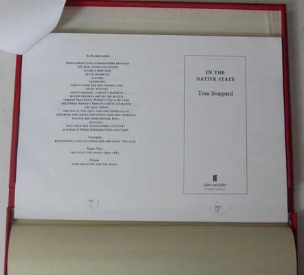 In the native state. 1991. Author's proof sheets, marked up with corrections, inscribed to Bruce Ritchie "Dear Bruce - as you see I have written a play - being for radio, it will remain a secret, relatively. The broadcast is on April 21. Delighted the Australian tour was achieved and so proud to be in the Bradman museum. Yours, Tom." Contained in a red linen box.