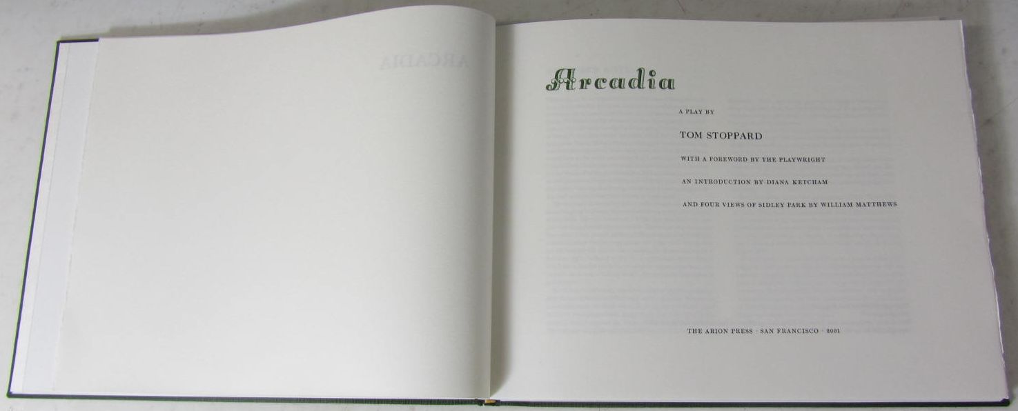 Arcadia: a play; with a foreword by the playwright: an introduction by Diana Ketcham and four views of Sidley Park by Wlliam Matthews. San Francisco: The Arion Press, 2001. Oblong folio, with four folding coloured illustrations, publishers' green ribbed cloth, printed paper labels to spine and upper cover, t.e. trimmed, others deckled, contained in a matching slip case, no 239 of 400 copies, signed by Tom Stoppard and William Matthews.
