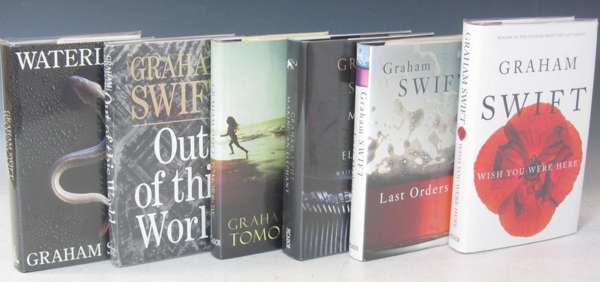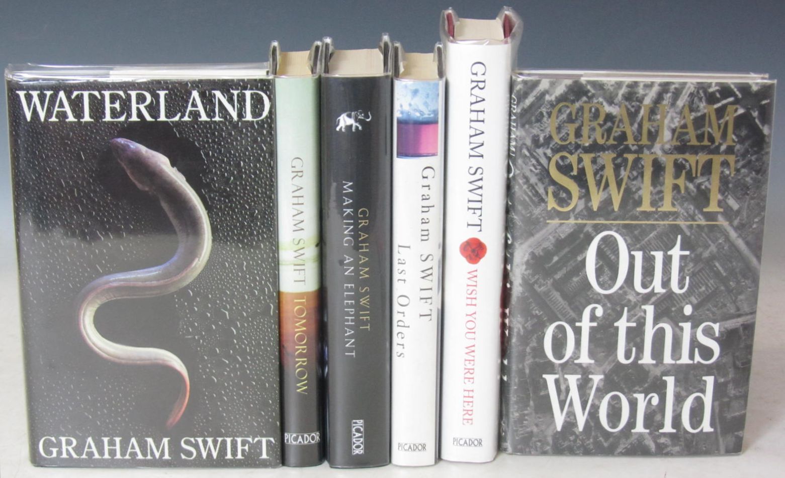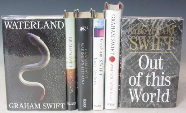Waterland. London: W. Heinemann, 1983. First edition, signed by the author, dustwrapper; [Idem] Out of this world. London: Viking, 1988. First edition, signed by the author, dustwrapper; [Idem] Last orders. London: Picador, 1996. First edition, signed by the author, dustwrapper; [Idem] Tomorrow. London: Picador, 2007. First edition, signed by the author, dustwrapper; [Idem] Making an elephant. London: Picador, 2009. First edition, signed by the author, dustwrapper; [Idem] Wish you were here. London: Picador, 2011. FIrst edition, signed by the author, dustwrapper, all original boards (6)