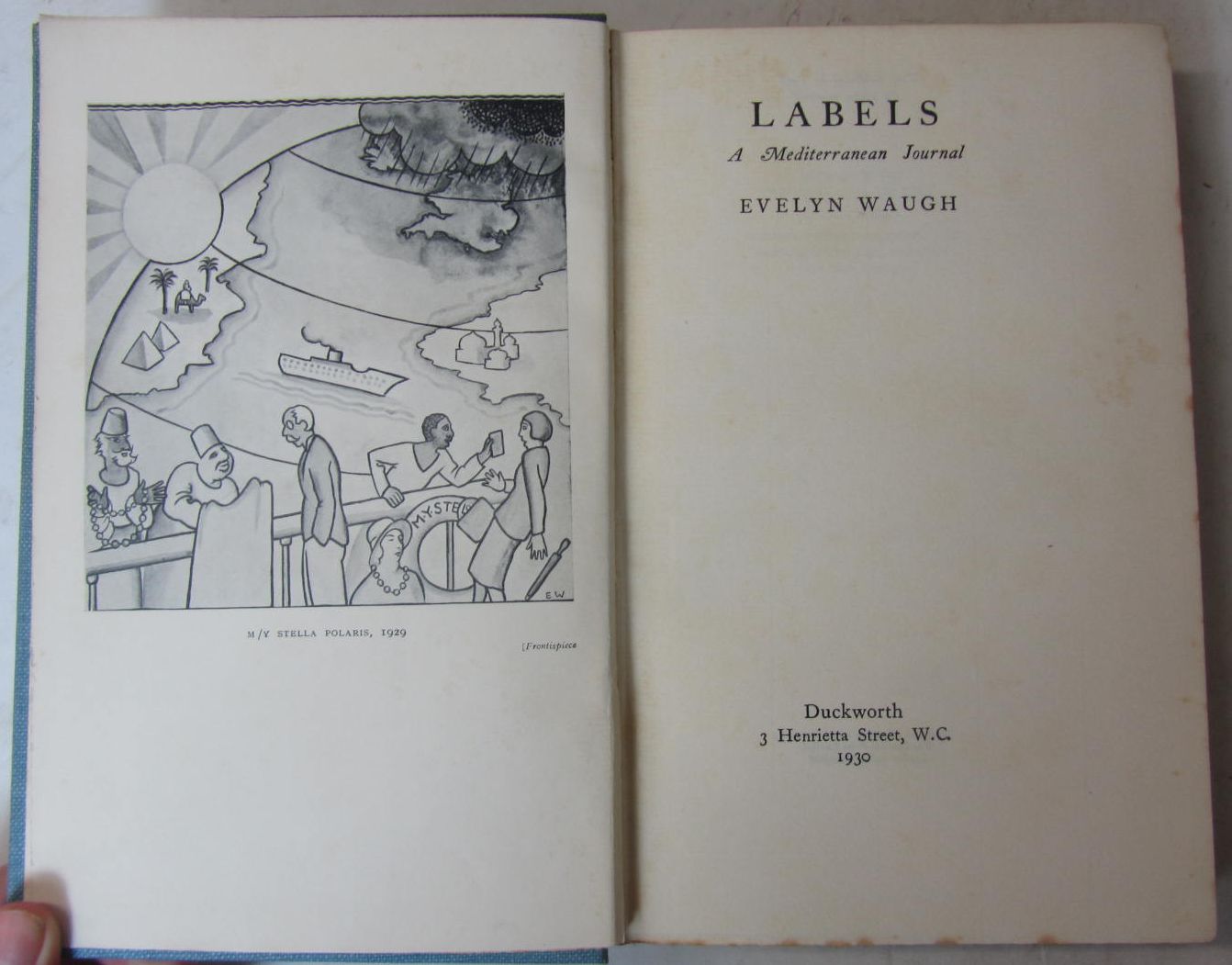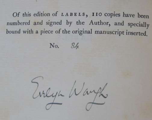 Labels: a Mediterranean journal. London: Duckworth, 1930. First edition, frontispiece, illusrated, 4 photographic plates, publisher's buckram, with a folding leaf of manuscript. bound in, frontispiece partly loose, slight fore-edge foxing, no. 84 of 110, signed by the author