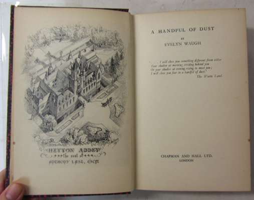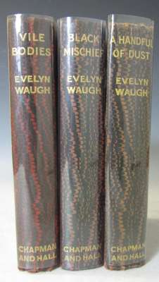 Vile bodies. London: Chapman & Hall Ltd., 1930. 8vo., First edition, red and black titlepage, publisher's red and black boards, slight rubbing to edges, a little fore-edge foxing; [Idem] Black mischief. Chapman and Hall, 1932. First edition, 8vo., map as frontispiece, red and black boards, small biro inscription on the front fee endpaper. London: Chapman and Hall, 1932. First edition, 8vo., map as frontispiece, red and black boards, small biro inscription on the front free endpaper; [Idem] A Handful of dust. London: Chapman and Hall Ltd., 1934. First edition, 8vo., frontispiece, publisher's red and black boards, edges a little rubbed (3)