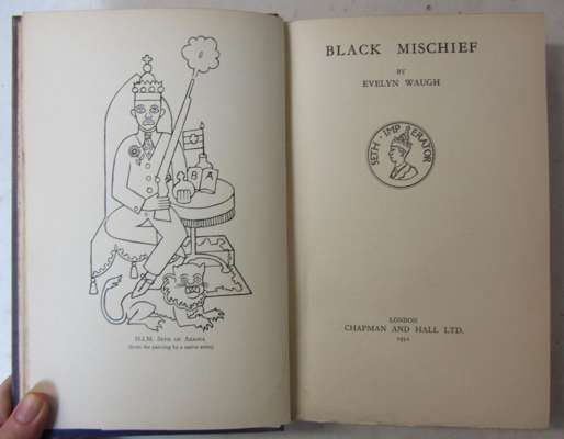 Black mischief. London: Chapman and Hall, 1932. First edition, 8vo., large paper, frontispiece and 8 other plates, publisher's cloth, t.e.g., others uncut, spine faded and upper cover partly faded, with the leather library label of Baron Rothermere, no. 33 of 250 copies signed by the author