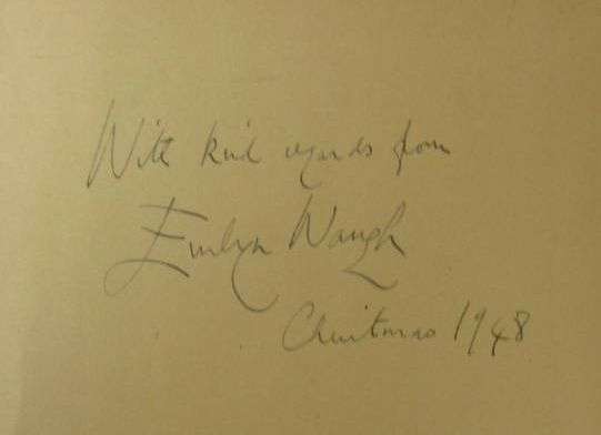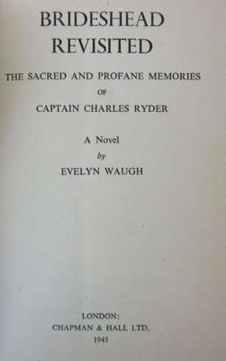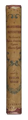 Brideshead revisited: the sacred and profane memories of Captain Charles Ryder. London: Chapman and Hall, 1945. First edition, 8vo., with "Cat. No. 5010/4" printed at the foot of the verso of the titlepage, publisher's cloth, dustwrapper, head and tail of dustwrapper chipped, short split (2.5 cms.) in wrapper at lower fold, ownership inscription on front fee pastedown dated 1945, with a sheet of paper loosely inserted and inscribed "With kind regards from Evelyn Waugh Christmas 1948."