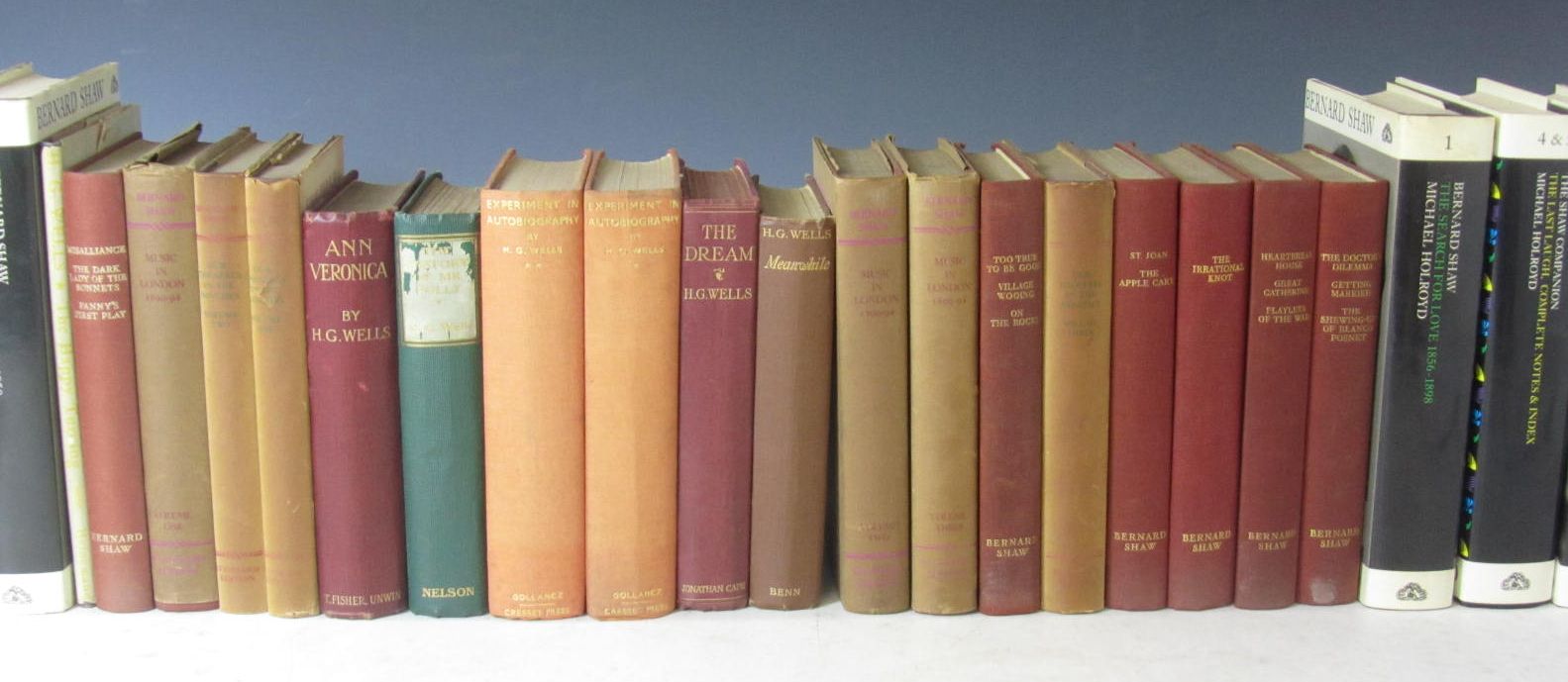 The history of Mr Polly. London: Nelson, 1910. First edition, original cloth; [Idem] The dream. London: J. Cape, 1924. First edition, original cloth; [Idem] Experiment in autobiography. London: Gollancz, 1934. First edition, 2 volumes, original cloth, faded and spotted, bookplates; Shaw, George Bernard [Works]. London: Constable, c.1932-1949. 40 volumes only, original brown cloth, a few with dustwrappers; Holroyd, M. Bernard Shaw. London: Chatto, 1988-92. 5 volumes, signed by the author, dustwrappers; Grossmith, G. & W. The diary of a nobody. Bristol: J.W. Arrowsmith, [1892]. First edition, 3pp. advertisements, original brown cloth, very slightly soiled; and several later works by Wells