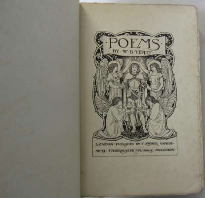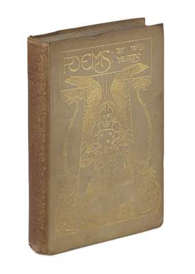 Poems. London: T. Fisher Unwin, 1895. First edition, 8vo., publisher's light brown cloth, decorated in gilt on both covers by Granville Fell, spine darkened and with wear to head and tail, corners bumped, some offsetting and spotting to endpapers, short split at upper inner joint, gift inscription on the half-title to Hildegarde Coghill, small bookseller's label of W. Mullan of Belfast at lower inner corner of front pastedown, one of 750 copies