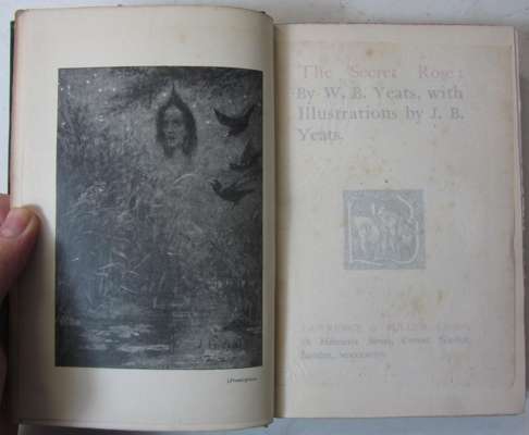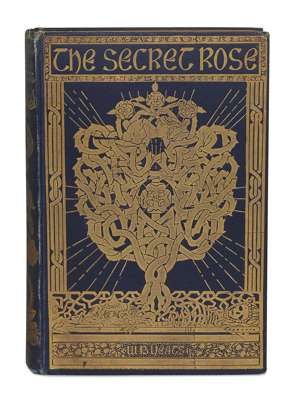 The secret rose; with illustrations by J.B. Yeats. London: Lawrence & Bullen Limited, 1897. First edition, 8vo., frontispiece and other plates, original blue cloth with elaborate gilt design by Althea Gyles, uncut, rubbed at head tail and extremities, spine slightly darkened, offsetting to endpapers, ownership inscription on the front free endpaper