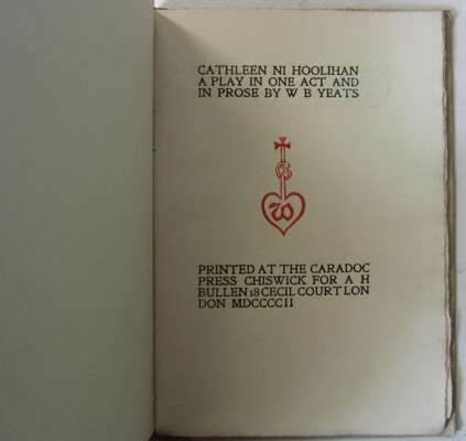 Note: Wade 40. One of 300 copies. The play first appeared in Samhain in 1902, although the lyrics had appeared in The United Irishman in May of the same year. It was actually written jointly with Lady Gregory although, according to Wade, Yeats rarely acknowledged this at the time.