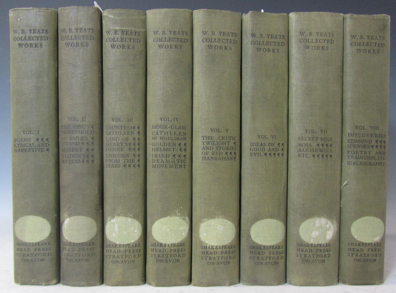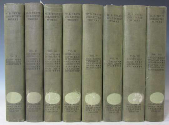 The collected works in verse and prose. Straford-on-Avon: Shakespeare Head Press, 1908. 8 volumes, 8vo., portrait frontispieces in alternate volumes, original quarter green buckram, grey paper boards, a little wear to heads and tails, oval library label removed from spines, library stamp of Bolton Public Library on verso of titles, repeated elsewhere, tear in p. 49 of volume 1 (8)