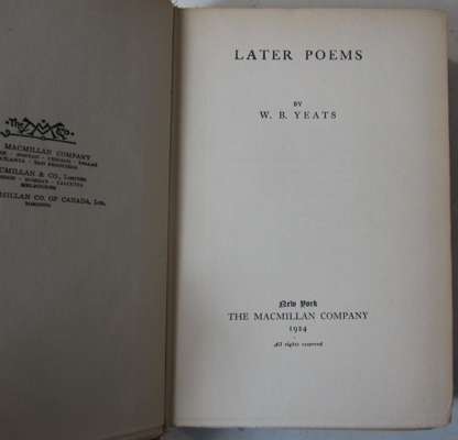 Later poems. New York: The Macmillan Company, 1924. First American edition, 8vo., publisher's brown paper boards, quarter blue cloth, printed spine and cover labels, uncut, head and tail rubbed, corners very slightly worn
