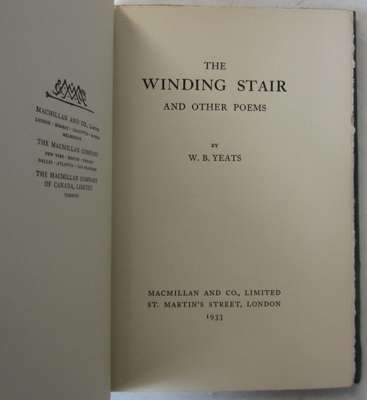 The winding stair and other poems. London: Macmillan and Co., 1933. First edition thus, 8vo., publisher's blind stamped and gilt cloth to a design by Sturge Moore, dustwrappers, uncut and partly unopened, with the errata slip at p. 85