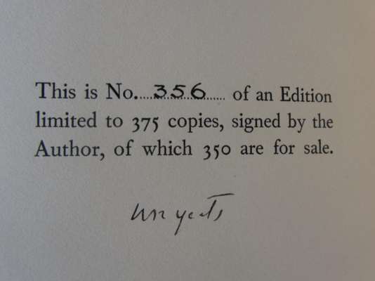 Note: Wade 209 & 10, noting that the two volumes were issued together in a brown cardbox slip case. No. 356 of 375 of which 350 were for sale, and signed by Yeats. Yeats had been engaged in revising the text sometime before his death in 1940 of which he had corrected the proofs and signed the pages bearing the notice of limitation. War subsequently prevented its publication until 1949.