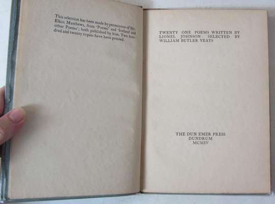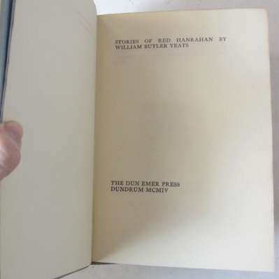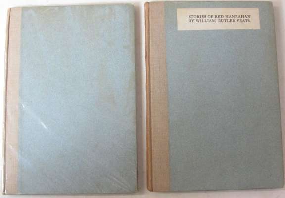 Stories of Red Hanrahan. Dundrum: The Dun Emer Press, 1904. First edition, 8vo., woodcut by Robert Gregory, original quarter linen, blue grey boards with matching endpapers, printed paper labels on spine and upper cover, uncut, spine label with a couple of nicks, slight rubbing to corners, light offsetting to endpapers; Johnson, Lionel Twenty one poems: selected by William Butler Yeats. Dundrum: The Dun Emer Press, 1904. First thus, 8vo., quarter linen, blue grey boards with matching endpapers, printed paper label on spine, uncut, label with a couple of nicks, slight rubbing to corners, offsetting to endpapers (2)
