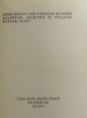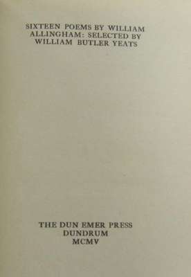 Some essays and passages; selected by William Butler Yeats. Dundrum: The Dun Emer Press, 1905. First edition, 8vo., quarter linen, blue grey boards with matching endpapers, printed paper label on spine, uncut, offsetting to endpapers, one of 200 copies. (Miller 6; Wade 232); Allingham, William Sixteen poems: selected by William Butler Yeats. Dundrum: The Dun Emer Press, 1905. First edition, 8vo., quarter linen, blue grey boards with matching endpapers, printed paper label on spine, uncut, spine a little rubbed, light offsetting to endpapers, one of 200 copies (Miller 7; Wade 234) (2)