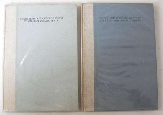 Twenty one poems; selected by W.B. Yeats. The Dun Emer Press, 1907. First edition thus, 8vo., printer's device on the titlepage, woodcut by Elinor Monsell, quarter linen, blue grey boards with matching endpapers, uncut, covers a little dusty, edges knocked, offsetting to endpapers; Yeats, W.B. Discoveries: a volume of essays. The Dun Emer Press, 1907. First edition, 8vo., with woodcut of charging unicorn on the titlepage in black, quarter linen, blue grey boards with matching endpapers, uncut, offsetting to endpapers (2)