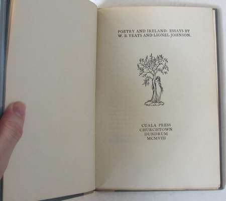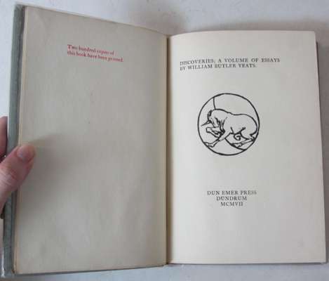 Note: 1. Miller 10; Wade 238. One of 200 copies. The colophon bears for the first time the staff of the Press, Esther Ryan and Beatrice Cassidy, a practice followed in succeeding books. The Dun Emer device appears for the first time on the titlepage. 2. Miller 11, describing the circular wood cut by Robert Gregory as being printed in red; Wade 72. One of 200 copies. The only other publication with Dun Emer imprint after this was the first number of the first series of A Broadside, June 1908.
