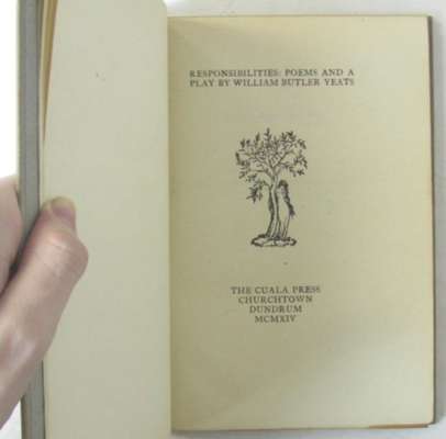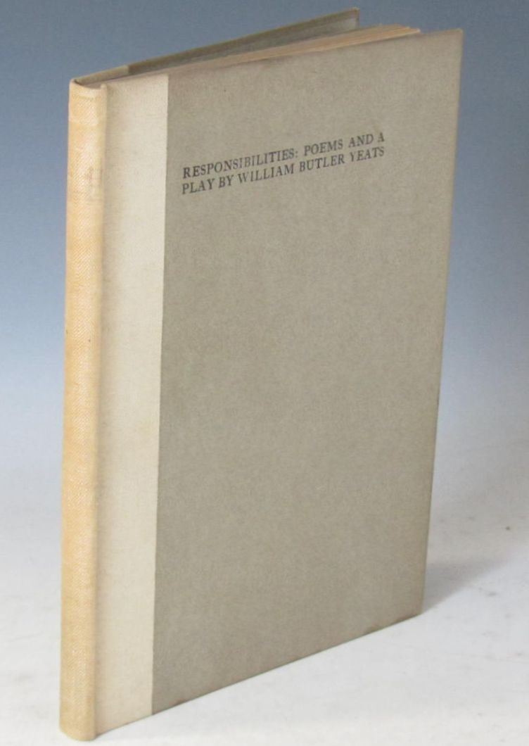 Responsibilities: poems and a play. Churchtown, Dundrum: The Cuala Press, 1914. First edition, 8vo., printer's device on the titlepage, quarter linen, grey coloured paper boards with matching endpapers, uncut, and unopened, binder's label of Galwey & Co, Dublin, small stain to the outer corner of last leaf of prelims