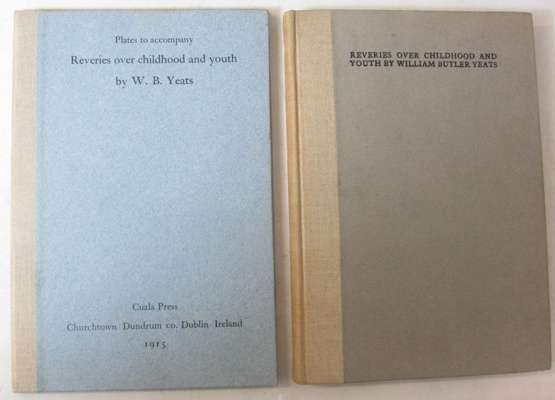 Reveries over childhood and youth. First edition, 8vo., woodcut vignette on the titlepage, quarter linen, grey coloured paper boards with matching endpapers, uncut and unopened. [AND] Plates to accompany reveries over childhood and youth. 2 volumes (the second a portfolio). Churchtown, Dundrum: The Cuala Press, 1915. 8vo., volume 1 with a woodcut vignette on the titlepage, quarter linen, grey boards, uncut and unopened, the portfolio with pale blue boards, containing 3 plates (2)