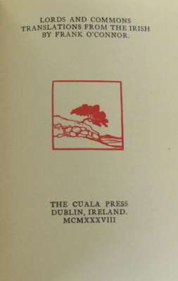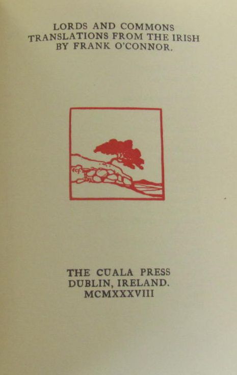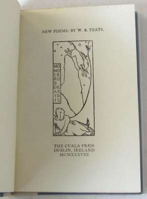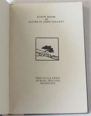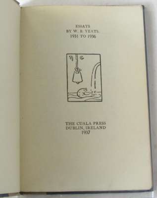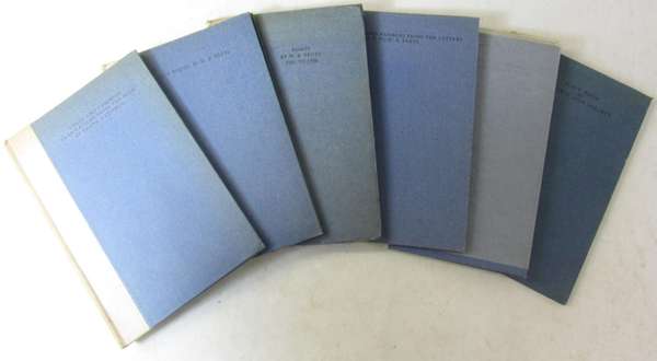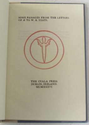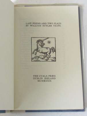 Some passages from the letters of AE to W.B. Yeats. Dublin: The Cuala Press, 1936. First edition, 8vo., woodcut device on the titlepage in red, original quarter linen, blue paper boards, uncut, one of 300 copies (Miller 56; Wade p. 393); Yeats, W.B. Essays by W.B. Yeats 1931 to 1936. Dublin: The Cuala Press, 1936. First edition, 8vo., woodcut device on the titlepage, original quarter linen, blue paper boards, uncut, a little wear at head and tail, one of 300 copies (Miller 57; Wade 194); [Idem] New poems. Dublin: The Cuala Press, 1937. First edition, 8vo., woodcut device on the titlepage, original quarter linen, blue paper boards, uncut, one of 450 copies (Miller 59; Wade 197); O'Connor, Frank Lords and commons: translations from the Irish. Dublin: The Cuala Press, 1938. First edition, 8vo., woodcut device on the titlepage in red, original quarter linen, blue paper boards, uncut, signature of the poet Wilfrid Gibson on front free endpaper, with the McInerney armorial bookplate, one of 250 copies (Miller 60; Wade 194); Yeats, W.B. Last poems and two plays. Dublin: The Cuala Press, 1939. First edition, 8vo., woodcut device on the titlepage, original quarter linen, blue paper boards, uncut, one of 500 copies (Miller 61; Wade 200); Gogarty, Oliver Elbow room. Dublin: The Cuala Press, 1939. First edition, 8vo., woodcut device on the titlepage, original quarter linen, blue paper boards, uncut, one of 450 copies (Miller 62) (6)