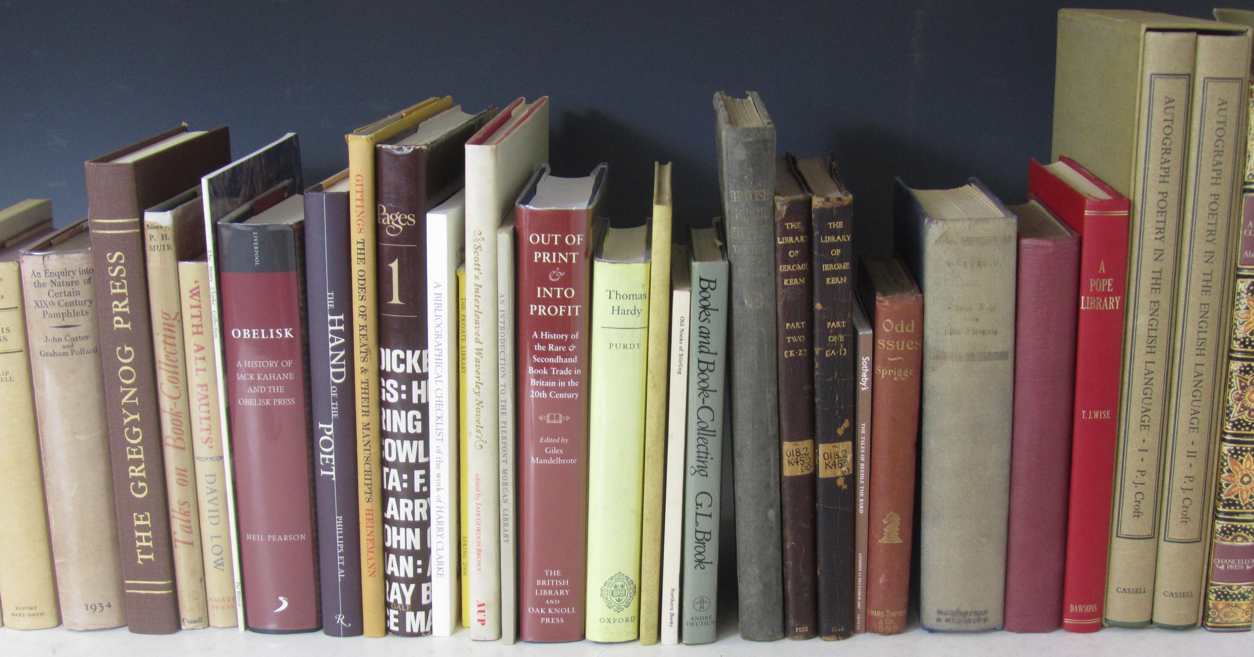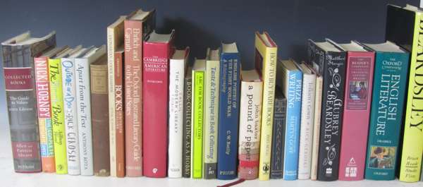 A collection of works of bibliography, history of the book and related subjects, to include: Carter, John & Graham Pollard An Enquiry into the nature of certain nineteenth century pamphlets. London: Constable, 1934. First edition, 8vo., publisher's cloth, dustwrappers, bookplate of the Revd. Richard King, signature on titlepage, t.e.g; Partington, Wilfred Thomas J. Wise in the original cloth: the life and record of the forger of the nineteenth-century pamphlets. London: Hale, 1946. First edition, 8vo., publisher's cloth, rubbed, label removed from lower pastedown; Wise, Thomas James A Pope library: a catalogue of plays, poems, and prose writings by Alexander Pope: collected by Thomas James Wise with a new introduction by K.I. Malsen; Purdy, Richard Little Thomas Hardy: a bibliographical study. Oxford: Clarendon Press, 1968. Publisher's cloth, dustwrappers; Thomas, Alan G. Great books and book collectors. London: Chancellor Press, 1975. Folio, publisher's cloth, dustwrappers; Salaman, M.C. British book illustration yesterday and to-day. London: The Studio, 1923. Folio, orginal blind decorated cloth, t.e.g., binding rubbed and stained; Hayward, John English poetry: a descriptive catalogue. London: National Book League, 1947. 4to., printed paper wrappers; Mandelbrote, Giles, editor Out of print & into profit: a history of the rare and secondhand book trade in Britain in the twentieth century. London: the British Library, 2006. 8vo., publisher's cloth, dustwrappers; Anderson Galleries The Library of Jerome Kern New York City sale number 2307, New York, 1929. 2 volumes, 8vo, limp cloth bindings; Harrop, Dorothy A. A History of the Gregynong Press. Pinner: Private Libraries Association, 1980. Folio, publisher's cloth; Reade, Brian Beardsley. London: Studio Vista, 1967. Folio, publisher's cloth, dustwrappers; Croft, P.J. Autograph poetry in the English language: facsimiles of original manuscripts from the fourteenth to the twentieth century. London: Cassell, 1973. 2 volumes, Folio, publisher's cloth, dustwrappers, in a slip case and a number of other related works; sold not subject to return (quantity)