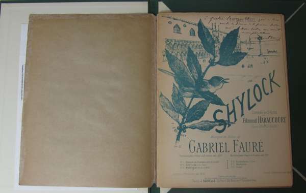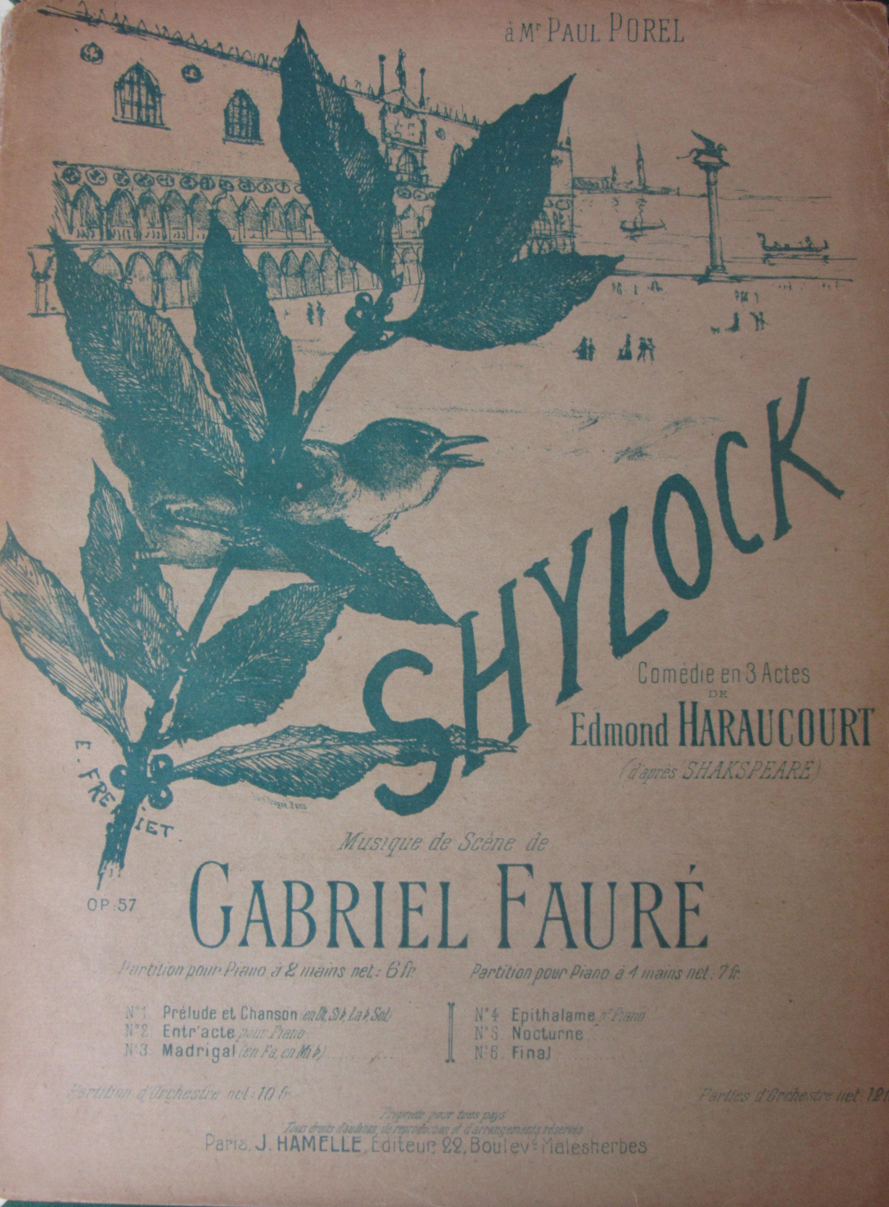 Shylock: comédie en 3 actes de Edmond Haraucout (d'après Shakspeare)[sic] Op 57. Paris: Hamelle, [1891]. First edition, piano-vocal score, 4to, original pictorial paper wrappers, preserved in a linen folder