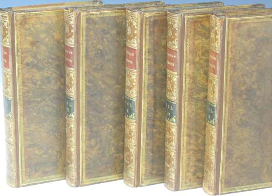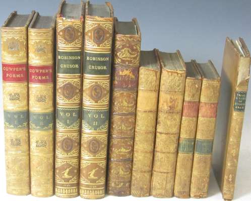 The Arabian nights, with engravings from pictures by Robert Smirke, R.A., London: W. Miller, 1802. 5 volumes, 8vo, 25 engraved plates, contemporary tree calf gilt, very neatly rebacked, head of one spine slightly rubbed; Cowper, William Poems. London, 1806. 2 volumes, 8vo, contemporary tree calf gilt; [Defoe, Daniel] The life and strange surprizing adventures of Robinson Crusoe. London: J. Stockdale, 1790. 2 volumes, 8vo, engraved titles and plates, contemporary tree calf gilt, head of spines rubbed; Addison, J. The free-holder. London, 1757. 8vo, contemporary tree calf gilt, head of spine rubbed; Milton, J. Paradise lost. London, 1770; Paradise Regain'd. 1772. 2 volumes, 12mo, engraved plates, contemporary calf, worn; Keate, George The poetical works. London, 1781. 2 volumes, 12mo, engraved frontispiece, title vignettes, plates, contemporary tree calf gilt, rubbed; [Aram] The trial and life of Eugene Aram. Richmond, 1832. 8vo, engraved frontispiece, calf, worn (15)