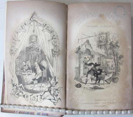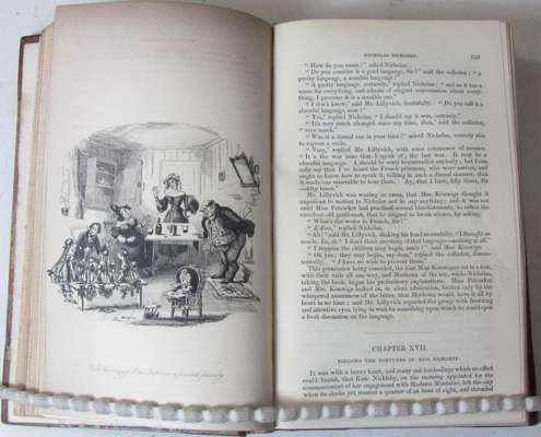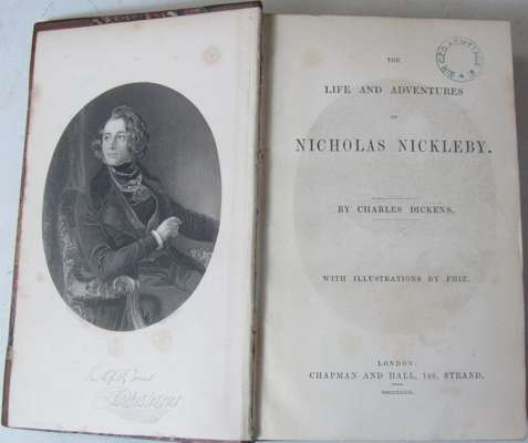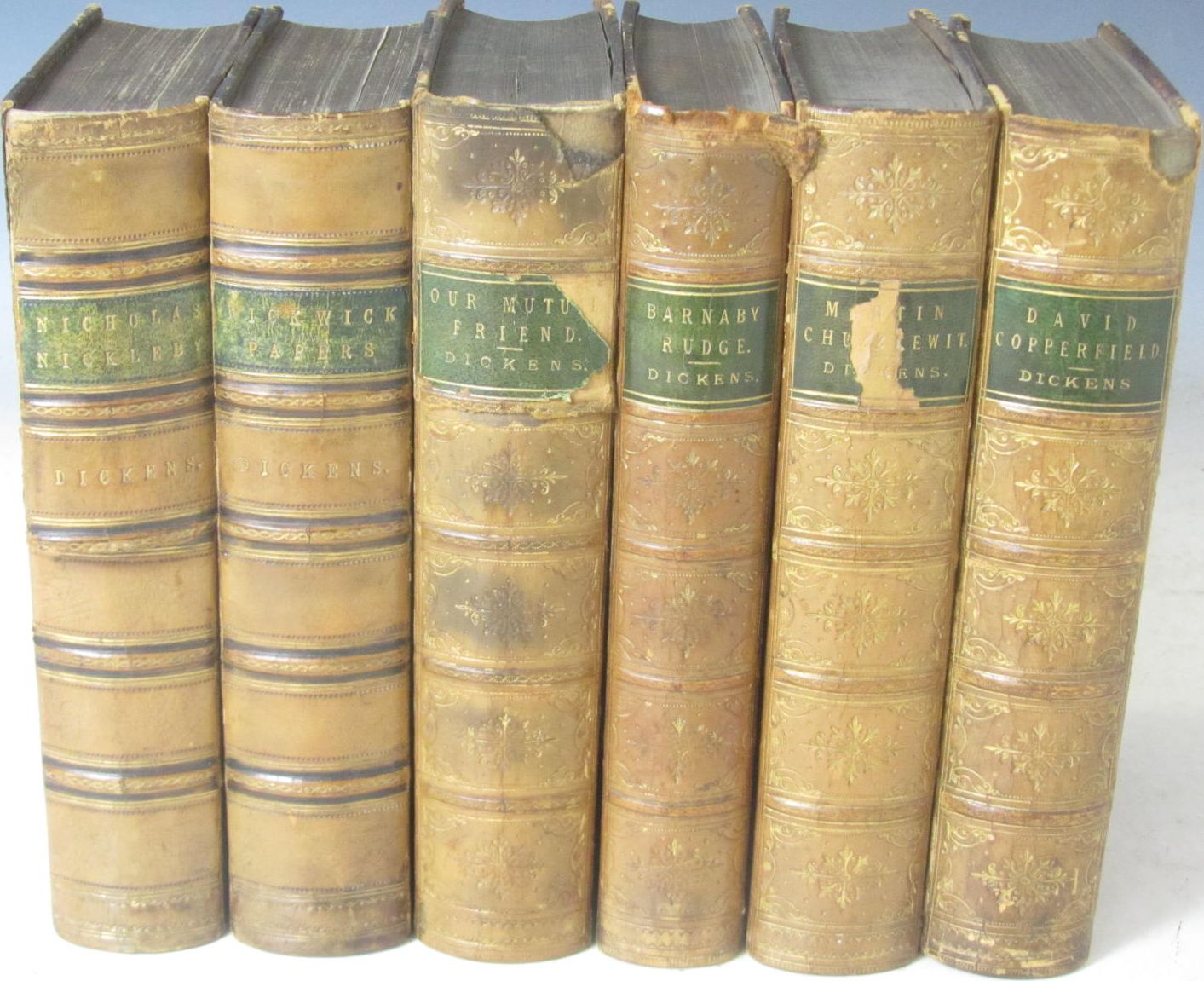 The life and adventures of Nicholas Nickleby. London: Chapman and Hall, 1839. First edition in book form, 8vo, engraved frontispiece and 39 plates by H.K. Browne "Phiz", contemporary half calf, plates somewhat browned, tear to spine, small stamp to title; Dickens, Charles The posthumous papers of the Pickwick Club. London: Chapman and Hall, 1837. First edition in book form, 1837, 8vo, additional engraved title, frontispiece and 41 plates by H.K. Browne "Phiz", contemporary half calf, plates somewhat discoloured; Dickens, Charles Our mutual friend. London: Chapman & Hall, 1865. 2 volumes in one, 8vo, first edition in book form, 1 additional title, plates by Marcus Stone, contemporary half calf, spine worn, joint splitting; and undated editions of David Copperfield, Bleak House, Little Dorrit, and Martin Chuzzlewit published by Chapman and Hall, and an 1871 Chapman and Hall edition of Barnaby Rudge (8)