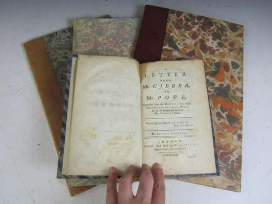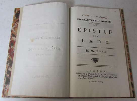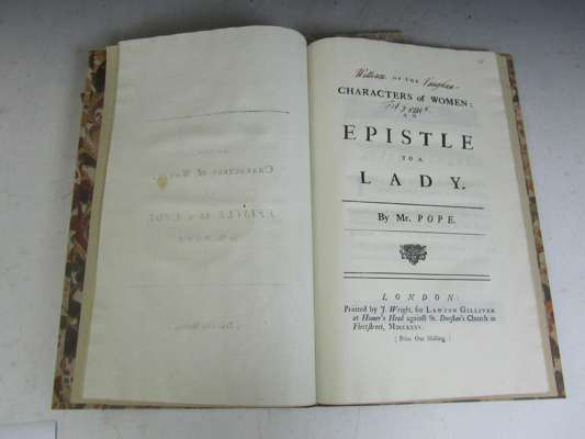 Of the characters of women: an epistle to a lady, by Mr. Pope. London: printed by J. Wright, for Lawton Gilliver, 1735. First edition, folio, modern quarter morocco, marbled boards, by Sangorski & Sutcliffe, ownership inscription on the title-page [Griffith 360, with "Fleetstreet misspelled "Flettstreet", but with the advertisement leaf B, signature of William Vaughan dated 1734/5 to title-page]; [Idem] An epistle to the Right Honourable Richard Lord Visc. Cobham, by Mr. Pope. London: Lawton Gilliver, 1733. First edition, folio, modern marbled boards, without the half-title and advert leaf at the end [Griffith 329; Foxon P920; Rothschild 1611]; [Whitehead, Paul] The state dunces; inscribed to Mr. Pope. London: W. Dickernson, 1733. First edition, folio, modern quarter sprinkled calf, marbled boards, title-page a little dusty, some uniform paper discolouration, [Foxon W426 The true first edition with 24 lines not in the J. Dickenson editions]; Cibber, Colley. A letter from Mr. Cibber, to Mr. Pope, inquiring into the motives that might induce him in his satirical works, to be so frequently fond of Mr. Cibber's name. London: W. Lewis, 1742. Second edition, 8vo, with half-title, quarter modern light tan calf, marbled boards, contemporary signature of J. Fletcher on half-title, small stain at upper inner margins [Rothschild 637: Guerinot p. 289, First issue in July of the same year] (4)