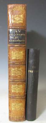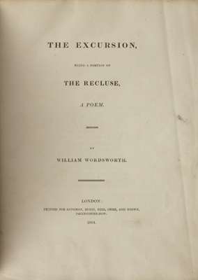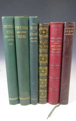The Excursion, being a portion of the Recluse: a poem. London: Longman, Hurst, Rees, Orme and Brown, 1814. First edition, 4to, with the half-title and errata leaf, contemporary calf, blind stamped and gilt border, spine decorated gilt in compartments, spine repaired, original backstrip retained, some light marginal spotting, loosely inserted the signature of William Wordsworth [AND] The Prelude, or growth of a poet's mind: an autobiographical poem. London: Edward Moxon, 1851. Second edition, 8vo, with alternative half-title and title at end to enable the volume to become volume VIII of the Poetical works, original cloth, recased; Tennyson, Alfred, Lord Idylls of the king. London: Edward Moxon & Co., 1859. First edition, elaborate green morocco gilt, previous owner's signature to endpaper; [Idem] Enoch Arden, etc. London: Edward Moxon & Co., 1864. First edition, 8vo, maroon morocco; [Idem] The holy grail... London: Strahan and Co., 1870. First edition, first issue, red morocco; and 3 other first editions by Tennyson (8)