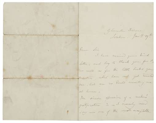 Autographed letter signed, from Charlotte Brontë to David Waldie, [L.R.C.S.] (1813-1889), thanking him for his appreciative comments regarding Jane Eyre and the gift of some "...little books", addressed from Gloucester Terrace, London, dated January 19th, no year given but a photocopy of the original envelope appears to read 1853, two hand-written pages of 175x112mm., each on one folded sheet, some very slight foxing and dust-soiling, letter is folded into three, with a few small closed tears to folds
